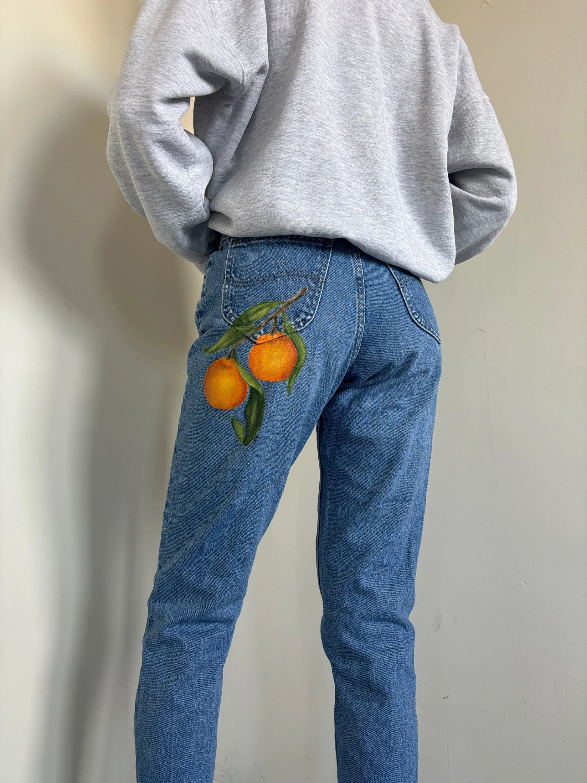 Hand-painted oranges on vintage Lee jeans. High-rise and tapered.