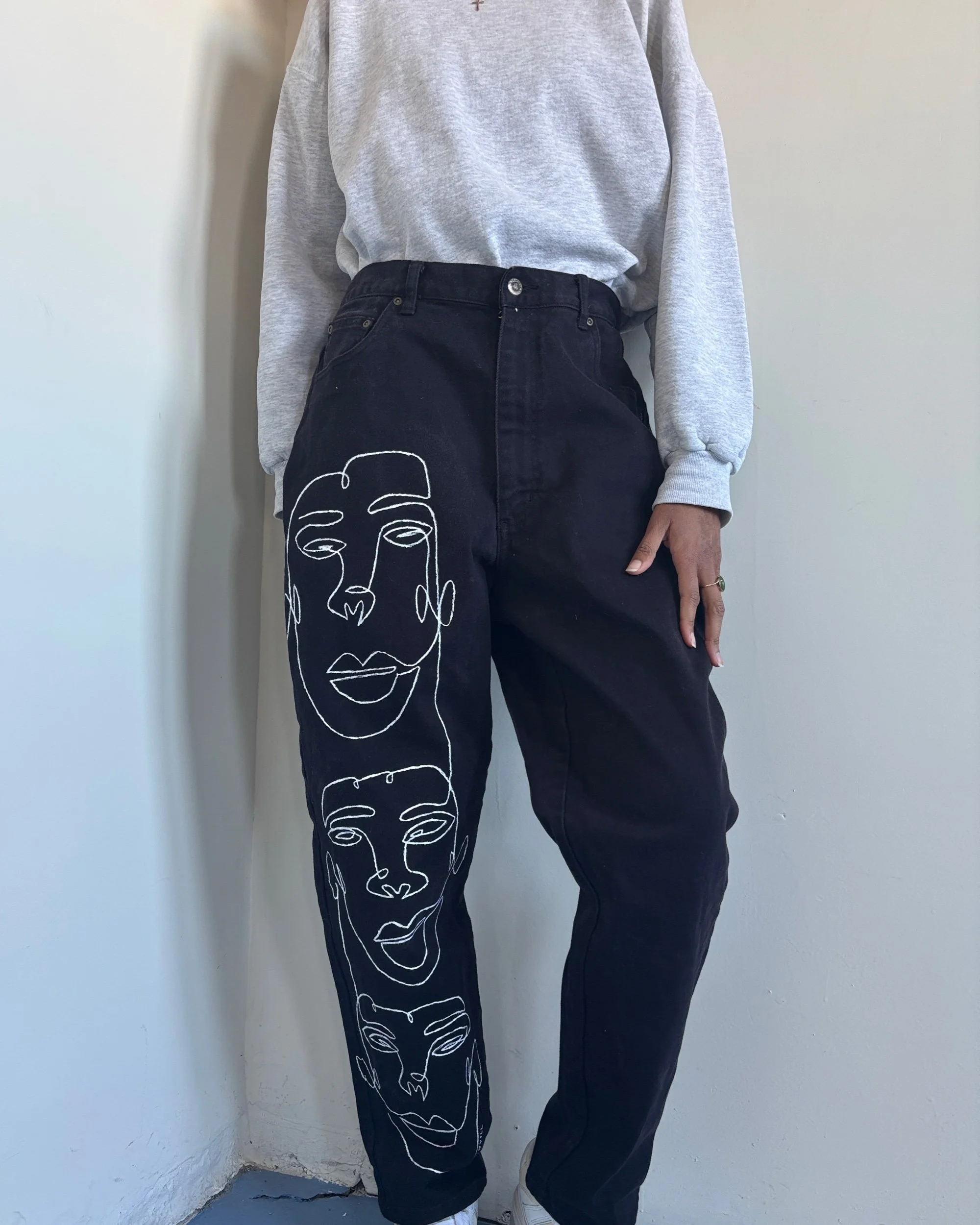 Hand-painted line faces on high waisted women’s vintage black jeans. Slightly tapered.